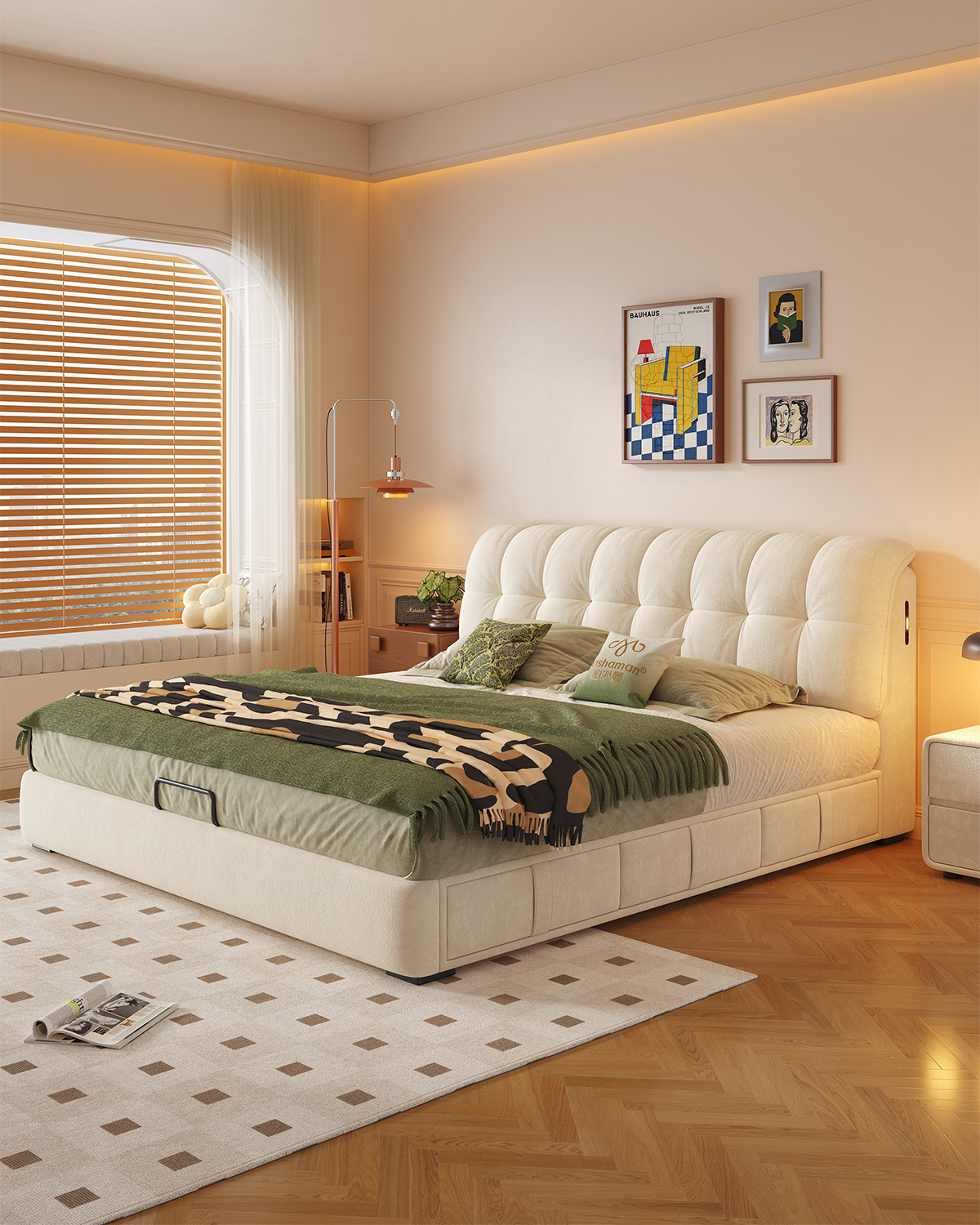可拆洗布艺床亲肤透气、柔软包裹感十足,拆洗方便易打理!静音床架不扰眠,高弹护脊贴合身形,安睡整晚超惬意。