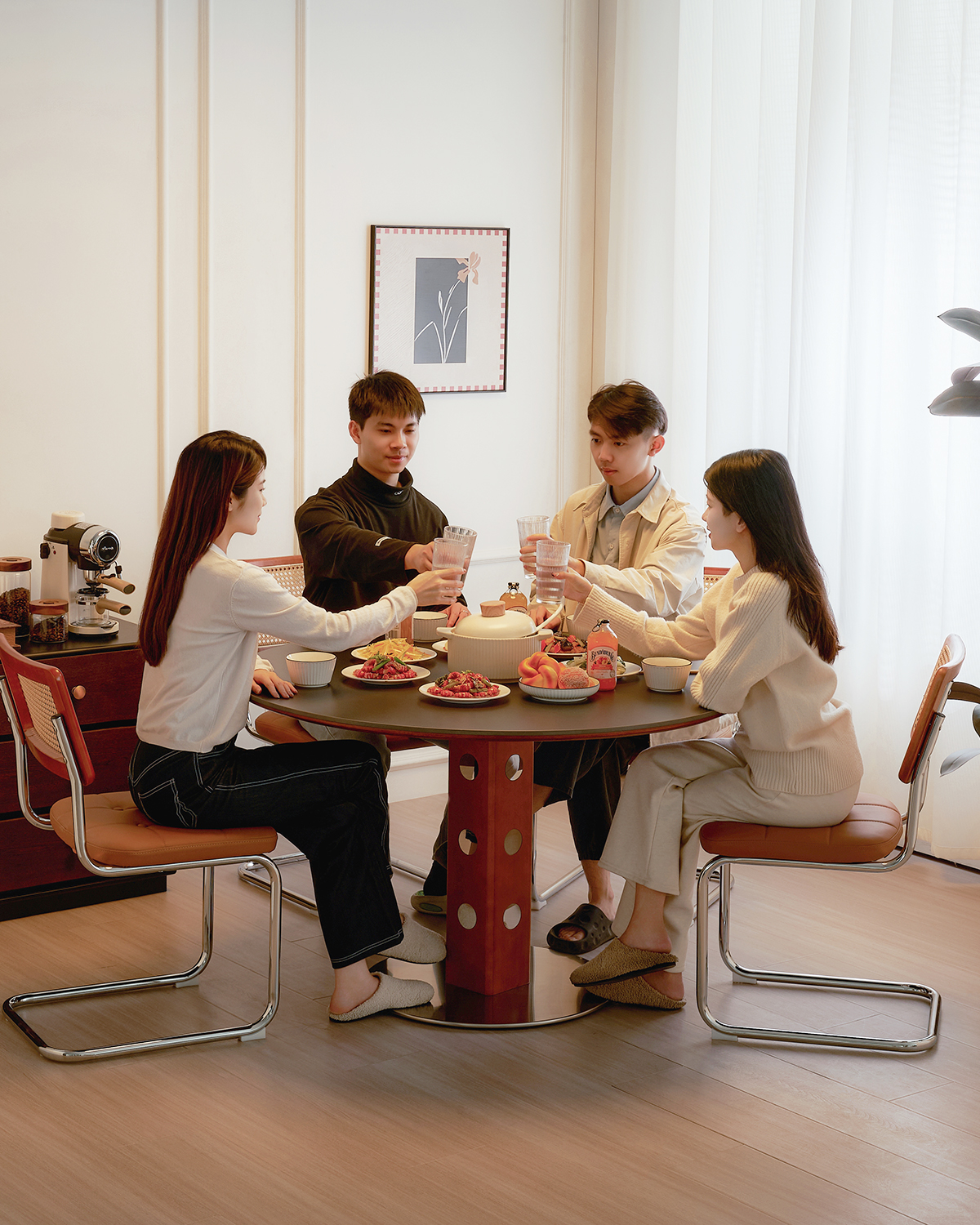 无棱角更安全,适配有娃家庭!稳固承重不晃,易清洁一擦即净,多人围坐团圆氛围浓。百搭各类家装,小户型也能轻松容纳,日常用餐、亲友小聚皆适配。